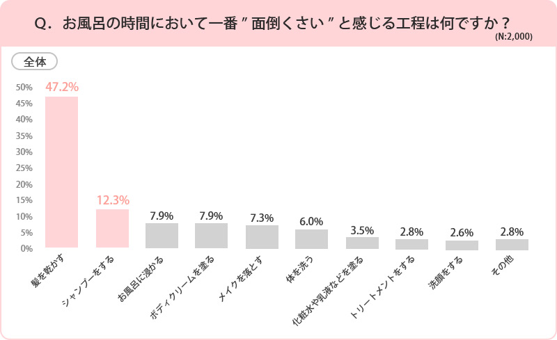※20~30代の女性2,000人に「お風呂の時間において一番“面倒くさい”と感じる工程は何ですか?」とインタビューした結果を表した表